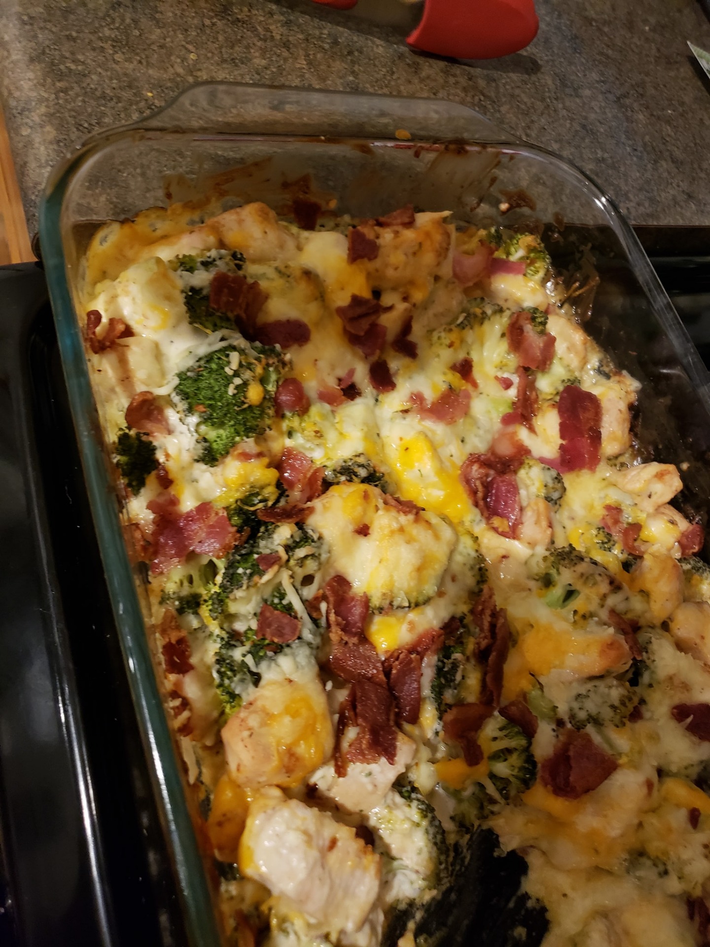 To the cream cheese mixture, you just made add the chicken, broccoli, 3/4 of the cheese, and the 1/4 cup bacon crumbles and mix well.
